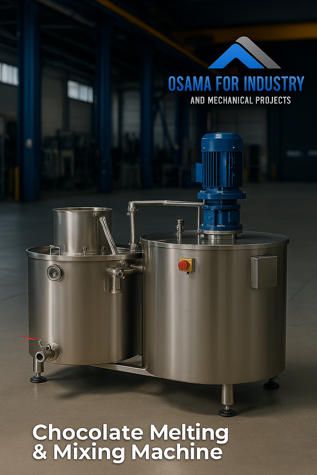 A stainless-steel melting and mixing unit designed for continuous chocolate processing. Ensures perfect temperature stability and homogeneous mixture for premium production lines.